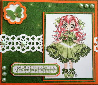 The challenge was to use colors of your country or a country you would like to see. I have always dreamed of being able to visit Ireland so I choose to use the colors of their flag! Here's wishing all your dreams come true.