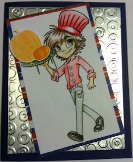 Today we are playing 'Pass the Pumpkin', Use a SBS image on your project and Pass the Pumpkin, it could be a relay race, Beach Volley Pumpkin, we'd even accept some Pumpkin Juggling, it's really up to you.I used "spaghetti Christian" for my pumpkin server. I colored the spaghetti on the plate a green slime color stamped some pumpkins cut them out and placed them on top the slime on his plate. I mounted him on a scrap left over from the opening ceremonies challenge and used a silver embossed background this time on a dark blue card base.